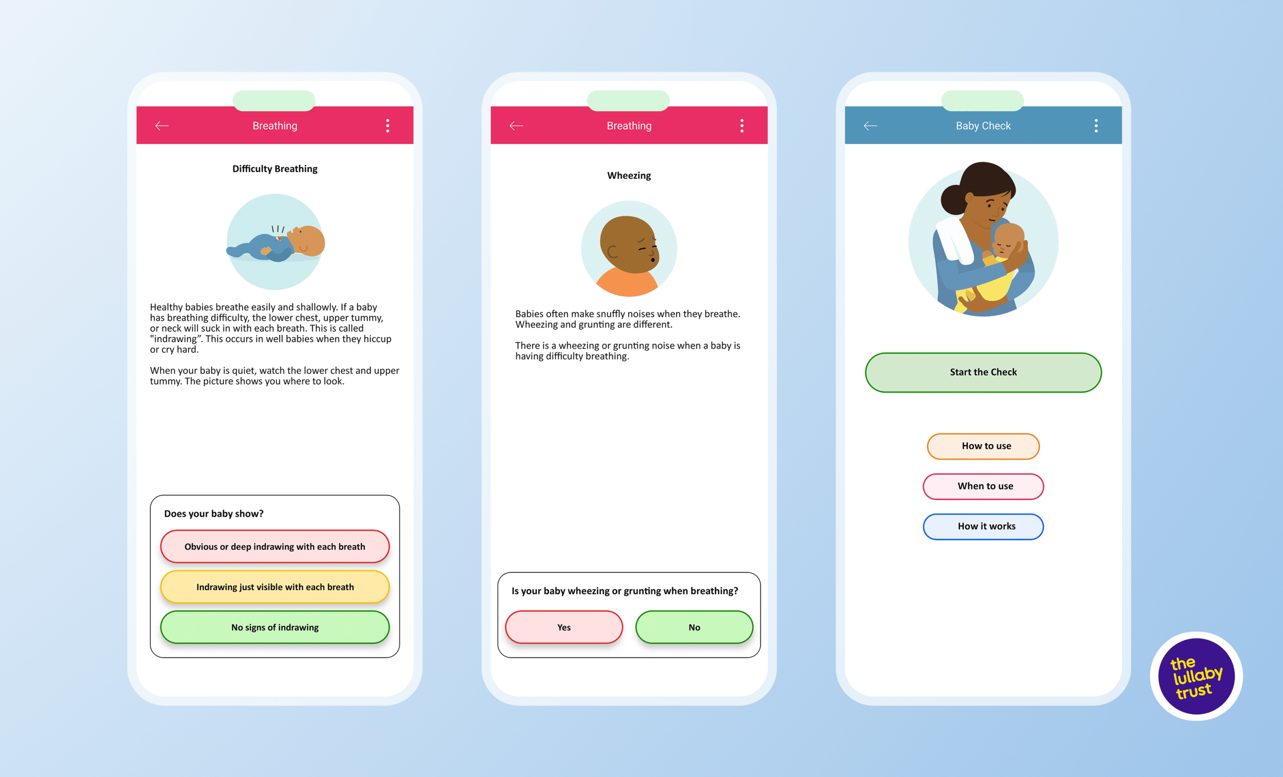 Baby Check is a mobile application developed in collaboration with The Lullaby Trust which designed to support parents and caregivers in assessing the health of infants aged 0–6 months. Determining when to seek medical attention can be challenging, particularly for non-clinical users. Imobisoft developed a structured, symptom-based assessment tool that translates user input into a clear risk classification using a Red–Amber–Green system. By combining clinical logic with intuitive mobile design, the solution enables faster, more confident decision-making and promotes timely medical intervention when needed.